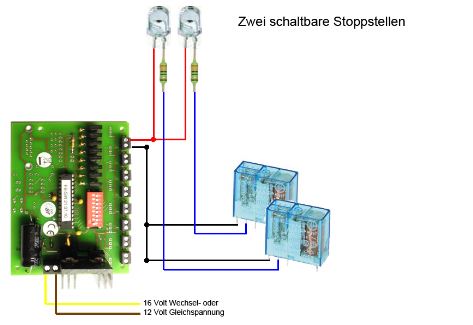 In dem Bild wird die Verkabelung zweier Infrarot-Stoppstellen mit Relais gezeigt.