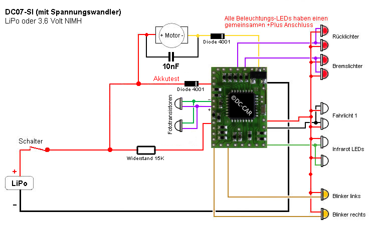In die Motorleitung werden Dioden eingefügt um die Spannung vom LiPo an die Motorspannung anzupassen.