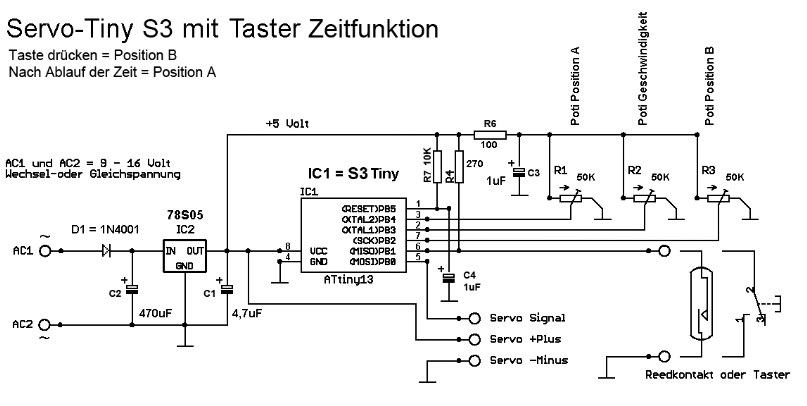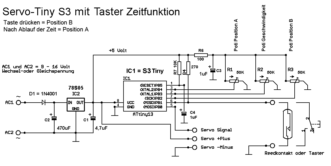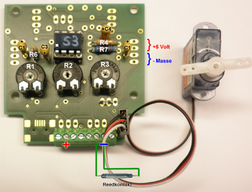 Wird der Anschluß mit Masse verbunden, so dreht sich das Servo in die Stellung "B".