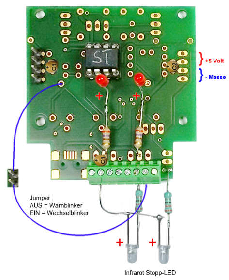 Notiz: Der Jumper wird nur beim Einschalten abgefragt. Ein späteres einsetzen / entfernen des Jumpers verändert die Blinkfolge nicht !
